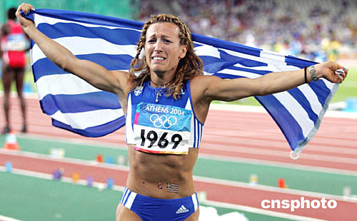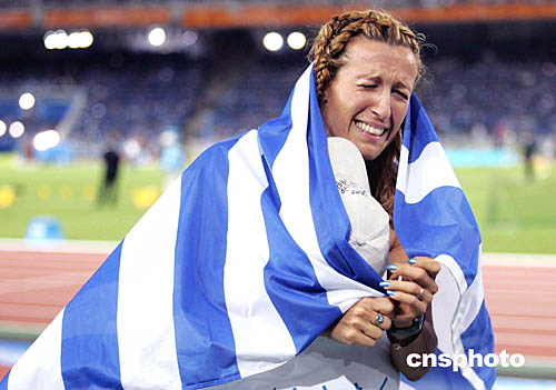 圖為希臘選手Hrysopiyi DEVETZI在獲得女子三級(jí)跳遠(yuǎn)亞軍后慶祝的場面。