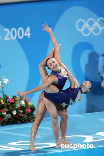 當地時間八月二十四日晚,中國選手顧貝貝與張曉歡在雅典奧運花樣游泳雙人自選動作比賽中,以灑脫漂亮的入水動作亮相。中新社記者:毛建軍