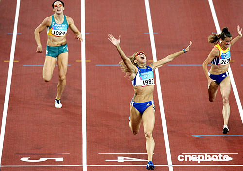 圖為希臘選手Fani Halkia戰勝烏克蘭的Tetiana Tereshchuk-Antipova和澳大利亞的Jana Pittman第一個沖過終點,奪得女子400米欄的冠軍。