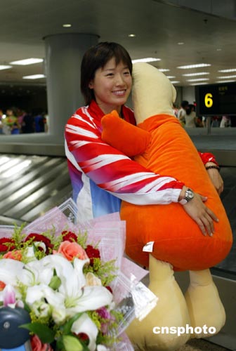 8月26日,北京首都國際機場又迎來一批載譽歸來的奧運健兒,包括羽毛球、乒乓球、游泳、體操、舉重等200多名選手,他們受到英雄般的歡迎。幾乎每個人都被鮮花包圍。圖為在雅典奧運會游泳女子100米蛙泳決賽中奪得金牌的羅雪娟被鮮花簇擁著走出機場。中新社記者:盛佳鵬