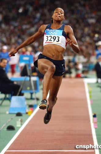 圖為當地時間25日,美國著名運動員瓊斯在跳遠比賽資格賽中的表現。