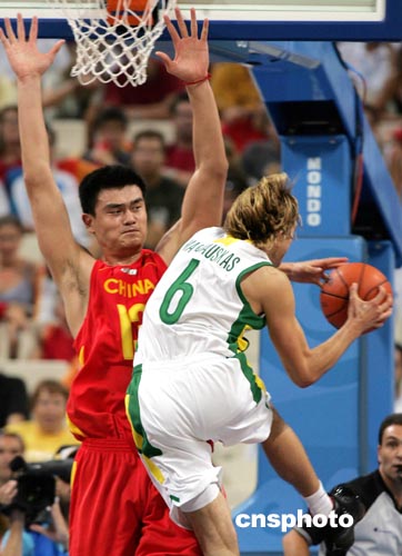 中新社雅典八月二十六日電(記者 王祖敏)在當地時間今天下午四時四十五分開始的奧運會男籃四分之一決賽中,中國男籃未能續寫“希臘神話”。盡管小巨人姚明獲得二十九分、十一個籃板的大號兩雙,中國男籃仍以九十五比七十五負于兩屆奧運會銅牌得主、歐錦賽冠軍立陶宛隊,無緣四強。