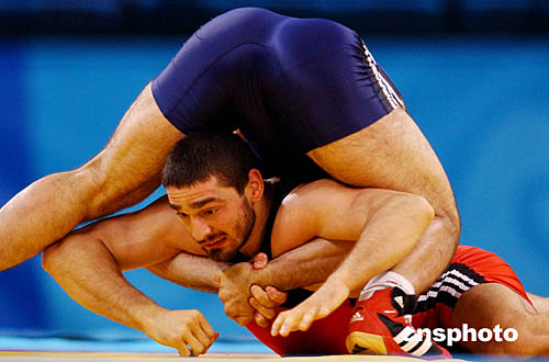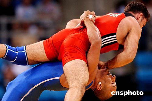 圖為當地時間8月26日舉行的男子74公斤級自由式摔交比賽中,烏茲別克斯坦選手Alexandr Dokturishivili和俄羅斯選手Vateres Samourgachev的比賽情況。