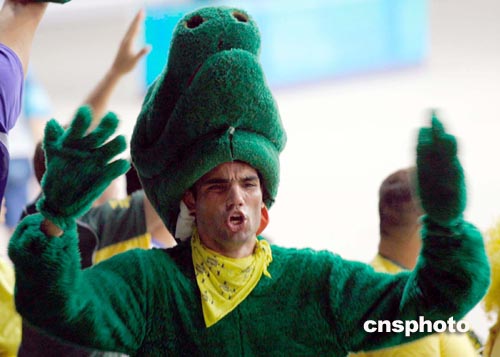 北京時間8月27日凌晨,俄羅斯、巴西女排在雅典奧運會女排半決賽中爭奪進入決賽的資格。圖為打扮成“大灰狼”的巴西球迷在為本國球隊吶喊助威。中新社記者:張煒
