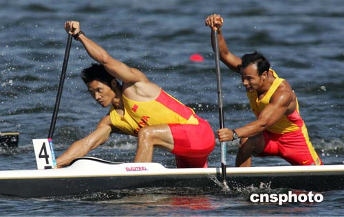 當?shù)貢r間八月二十八日,中國選手孟關良、楊文軍在雅典奧運男子五百米雙人劃艇比賽中奪得金牌。中新社記者:毛建軍