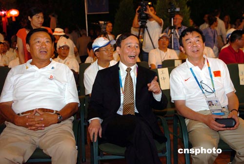 圖為北京奧運組委會執行主席袁偉民、王岐山和中國國家旅游局局長何光暐(從右到左)在啟動儀式上。