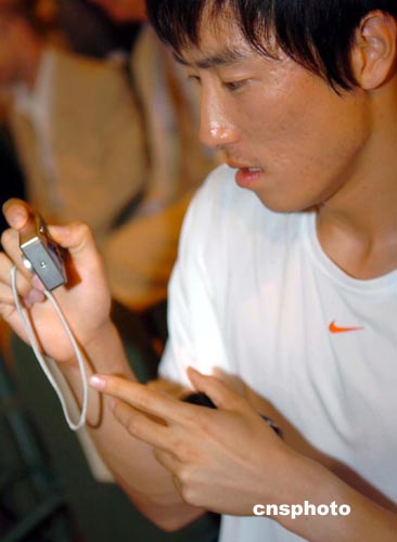 新“飛人”劉翔在啟動儀式上擺弄數碼相機。