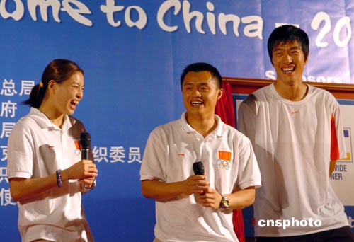 圖為奧運冠軍劉翔、彭勃和吳敏霞(從右到左)出席啟動儀式。