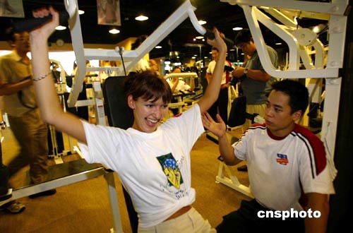 圖為參賽模特在杭州一家健身俱樂部內進行器械練習。