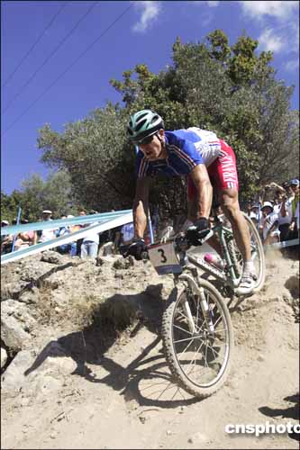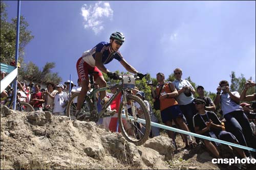 在當地時間28日進行的山地男子自行車越野比賽中,法國選手阿布薩隆用時2小時15分03秒,獲得冠軍。