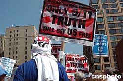 今天上午,來自全美的布什反對者匯集到曼哈頓十四街,有越戰老兵、伊拉克陣亡士兵的家屬、學生、作家、家庭主婦,他們從這里向曼哈頓中城行進。游行隊伍綿延了近兩公里,由于人數過多,在行進了五個街區后,游行隊伍一度停滯。