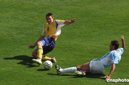 在當地時間28日進行的奧運會男子足球決賽中,阿根廷隊以1-0擊敗巴拉圭,獲得冠軍。圖為Cristian Gonzalez與Edgar Barreto激烈拼搶的鏡頭。