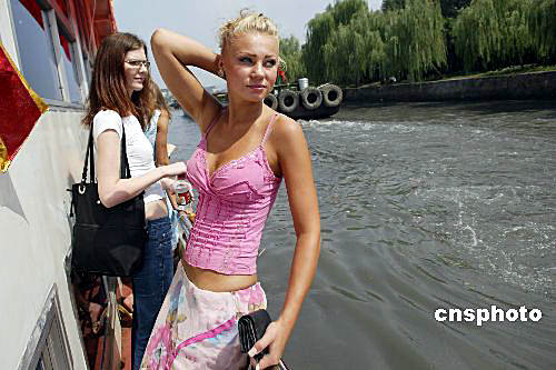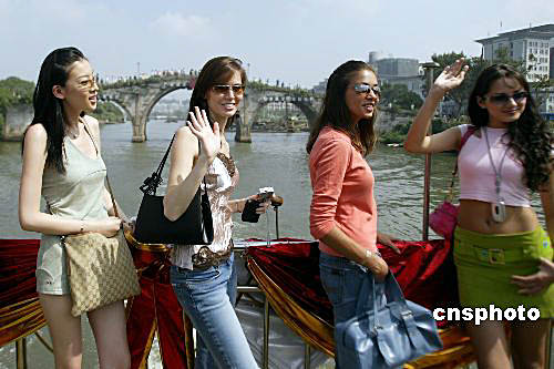 8月30日,參加2004年新絲路世界模特大賽的二十九個(gè)國(guó)家和地區(qū)的四十多名選手齊聚浙江省杭州市,開始她們的時(shí)尚杭州之旅,大賽組委會(huì)組織參賽佳麗們游覽西湖、乘船沿運(yùn)河觀光,逛杭州著名的河仿街和絲綢城,夜晚竹海漂流,使模特們進(jìn)一步貼近杭州,貼近市民生活。大賽決賽將與9月5日在杭州舉行。中新社記者 盛佳鵬 攝