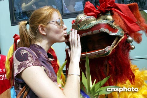 模特在杭州與舞獅親密接觸。8月30日,參加2004年新絲路世界模特大賽的二十九個國家和地區的四十多名選手齊聚杭州,開始她們的時尚之旅。近年杭州強力塑造“時尚旅游城市”形象。中新社記者:盛佳鵬