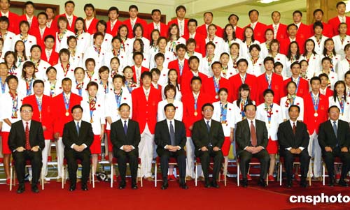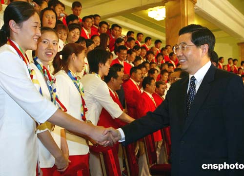 九月二日,中國國家主席胡錦濤等黨和國家領導人在北京人民大會堂接見了剛剛從雅典歸來的中國體育代表團全體成員、后勤工作人員及參與報道工作的新聞工作者代表。中新社記者:鄭萍萍