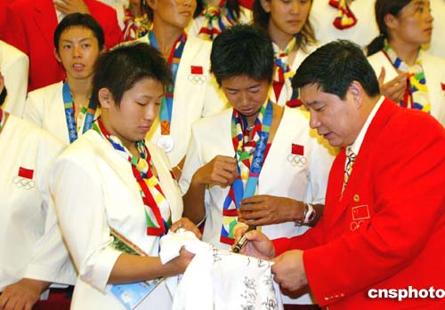 九月二日,第二十八屆奧運(yùn)會(huì)中國(guó)體育代表團(tuán)表彰大會(huì)在北京人民大會(huì)堂舉行,同為奧運(yùn)冠軍的小將王旭、李婷向前輩王義夫求取簽名。中新社記者:鄭萍萍