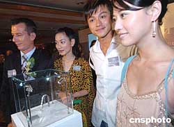 瑞士名表MILUS九月三日在香港舉行發布會,展示其價值高達99萬的TARASEA鉆石腕表。圖為影星、著名設計師等出席揭幕儀式。作者:錢興強