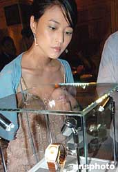 香港影星周海湄在發布會上觀看瑞士新款名表系列展示。 作者:錢興強