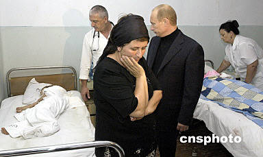 俄羅斯總統普京在飛抵北奧塞梯共和國別斯蘭市后看望在人質事件中的受傷人員。