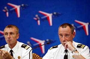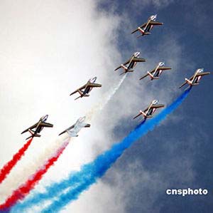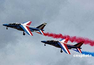 中新網9月7日電 日前,法國空軍飛行表演隊先遣組組長讓·馬克在北京透露,“法蘭西巡邏兵”飛行表演隊10月將隨希拉克總統到訪北京,在北京南苑機場舉行兩場表演,然后赴武漢、珠海、香港巡演。法蘭西巡邏兵是世界五大特級飛行隊之一,此次隨總統出訪是第一次。表演隊使用阿爾法噴氣教練機。此次表演由國防部外事辦公室和空軍有關單位主辦。中新社記者:鄭萍萍
