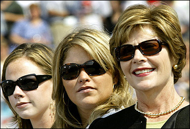 中新網9月5日電 據法新社報道,美國總統布什的家人,他的兩個雙胞胎女兒芭芭拉(左)、簡娜(中)以及妻子勞拉在布什在賓夕法尼亞州一個老兵紀念館里面對觀眾演講時在一旁為他助威。(固山)