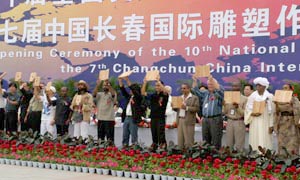 第七屆雕塑展邀請了二十三個國家的雕塑家現場創作了二十六件作品,其中有十個國家尚未與中國建交。圖為部分雕塑家獲長春市政府頒發的“長春杯”榮譽證書。