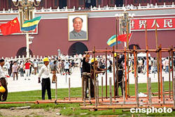 北京市政工人九月五日開始在天安門廣場搭建腳手架,準備建立組裝國慶節的大型花壇,迎接中華人民共和國成立55周年。中新社記者:鄒憲