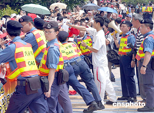 國(guó)家?jiàn)W運(yùn)金牌代表團(tuán)9月7日在香港展開(kāi)觀光之旅,金牌選手分別在香港多處名勝景點(diǎn)參觀,所到之處均深受廣大市民熱烈歡迎,在雅典奧運(yùn)勇奪跳水男子雙人10米高臺(tái)金牌的“跳水王子”田亮在尖沙咀星光大道參觀,并為小學(xué)生簽名留念,在場(chǎng)民安隊(duì)員加強(qiáng)護(hù)欄。作者:鄧慶樂(lè)