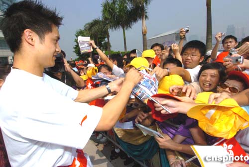 隨后,劉翔和田亮等一批運(yùn)動(dòng)員前往尖沙嘴的星光大道觀光,在那里同樣受到千名狂熱的市民和學(xué)生重重包圍及追捧。一些學(xué)生爭(zhēng)相向選手索取簽名,而金牌運(yùn)動(dòng)員也不讓他們失望,不時(shí)走近人群握手、簽名。拿到劉翔、田亮簽名的小學(xué)生,高興得雀躍不已。