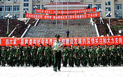 今年九月,重慶市云陽(yáng)各中小學(xué),為培養(yǎng)學(xué)生良好的行為習(xí)慣和學(xué)習(xí)紀(jì)律及增強(qiáng)學(xué)生的體質(zhì),在開(kāi)學(xué)后,聘請(qǐng)縣一批武警、消防中隊(duì)官兵,在校園里對(duì)新生學(xué)生進(jìn)行系列化的軍訓(xùn)。近兩年來(lái),移民搬遷學(xué)校環(huán)境改善,學(xué)生增加,他們已為這些學(xué)校軍訓(xùn)新生三千四百多人次,此次三百多名新生,將進(jìn)行七天軍訓(xùn)。作者:饒國(guó)君