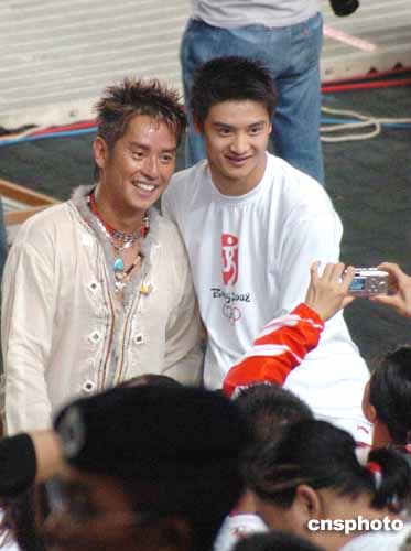萬眾矚目的“奧運精英大匯演”7日晚上在香港大球場舉行,國家奧運金牌選手和數萬名香港市民會聚在此,共享中國在雅典奧運會奪金的喜悅和榮光。圖為金牌選手田亮邀請演出嘉賓譚詠麟合影。作者:洪少葵
