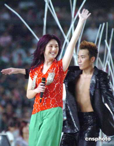 萬眾矚目的“奧運(yùn)精英大匯演”7日晚上在香港大球場舉行,國家奧運(yùn)金牌選手和數(shù)萬名香港市民會聚在此,共享中國在雅典奧運(yùn)會奪金的喜悅和榮光。圖為香港歌星楊千嬅為晚會演。作者:洪少葵