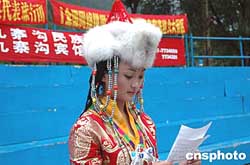 世界遺產(chǎn)四川九寨溝山靈水秀,這里的藏族姑娘如同山水一樣美麗動人。一位藏族姑娘正盛裝致辭歡迎遠(yuǎn)道而來的游客。中新社記者:田地
