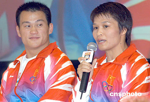 國家奧運金牌代表團9月8日在香港大學陸佑堂與學生真情對話,女子柔道52公斤級金牌得主冼東妹細訴奪金歷程,身旁為舉重69公斤級金牌得主張國政在旁細心聆聽。作者:鄧慶樂