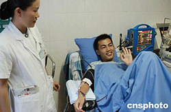 年僅十九歲、現(xiàn)就讀于廈門南洋學(xué)院的在校大學(xué)生張良建(右一),九月九日在福建醫(yī)科大學(xué)附屬協(xié)和醫(yī)院輸血科干細(xì)胞采集室內(nèi)接受造血干細(xì)胞采集,引起有關(guān)專家的重視。這是迄今為止福建省首例在校大學(xué)捐獻(xiàn)造血干細(xì)胞。據(jù)了解,福建省現(xiàn)有十三萬名患者等待造血干細(xì)胞移植,每年新增白血病患者約一千二百人。作者:劉可耕