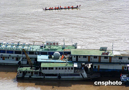 據當地防汛部門提供的信息,2004年9月8日12時30分,上游川江航道秋汛最大洪峰順利通過重慶市云陽縣,當地未有任何損失。因持續強降雨影響,長江上游宜賓河段、嘉陵江水位猛漲,洪流造成重慶主城“水漫金山”。但三峽庫區由于移民搬遷、普遍居住海拔提高和防洪措施早安排,得以安然渡汛。圖為洪峰過去,一只龍船在新縣城碼頭前游弋。作者:饒國君