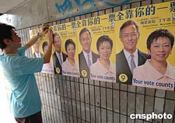 香港2004立法會選舉前夕,各地區立法會候選人進行最后拉票活動,圖為在新界西選區候選人抓緊時間最后張貼海報宣傳造勢。作者:錢興強
