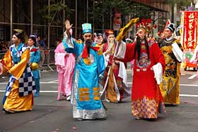 華僑華人和留學生組成了本次游行中人數最多、聲勢最浩大的隊伍,不但有舞龍、舞獅、鑼鼓,還有腰鼓、秧歌以及表現中國京劇藝術、少數民族服裝等傳統文化的表演分隊,許多路邊的觀眾也揮動中國國旗并熱烈鼓掌。