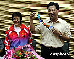 第二十八屆雅典奧運(yùn)會(huì)女子柔道五十二公斤級(jí)冠軍冼東妹的家鄉(xiāng)——廣東肇慶,九月十三日下午舉行盛大的歡迎儀式,并以六十萬(wàn)元人民幣重獎(jiǎng)自己的優(yōu)秀女兒冼東妹。圖為肇慶市副市長(zhǎng)黃玲陪同冼東妹步入會(huì)場(chǎng)。據(jù)悉,肇慶市委、市人民政府授予冼東妹肇慶市勞動(dòng)模范、“三八”紅旗手、“肇慶市杰出青年”等榮譽(yù)稱號(hào)。同時(shí),四會(huì)授予她四會(huì)市勞動(dòng)模范、四會(huì)“三八”紅旗手、“四會(huì)市杰出青年標(biāo)兵”等稱號(hào);四會(huì)石藝國(guó)際集團(tuán)贈(zèng)送一套高級(jí)公寓給冼東妹。作者:黃耀輝