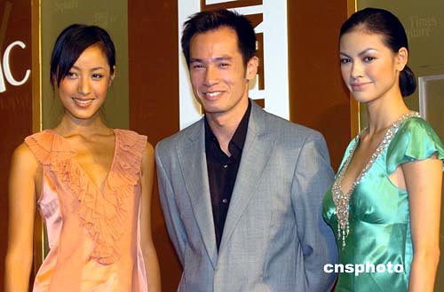 香港藝員陳豪(中)與名模蔣怡(左)﹑Rosemary14日出席香港時代廣場“時代b2”開業儀式。