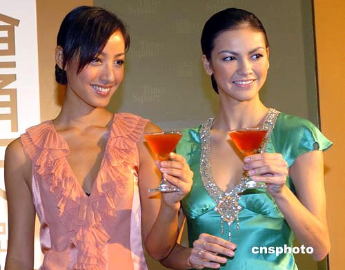 香港名模蔣怡(左)﹑Rosemary14日出席香港時代廣場“時代b2”開業儀式。作者:趙振清