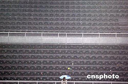 九月十五日晚,由于再次下雨,在北京網球中心的中央球場進行的中國網球公開賽ATP男子單打比賽被迫推遲,但有癡心的女球迷仍在雨中坐在觀眾席上不肯離去,等待雨停后繼續觀看比賽。中新社記者:盛佳鵬