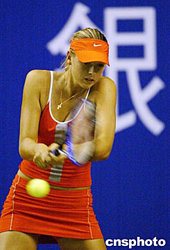 九月十八日,在“德意志銀行杯網球日”活動中,網壇新星俄羅斯十七歲的莎拉波娃與中國選手晏紫,在北京國家體育總局訓練局網球館內進行一場慈善表演賽,最終莎拉波娃以二比零取勝。圖為莎拉波娃在比賽中。中新社記者:盛佳鵬