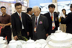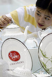 曾在中國上海APEC會議首腦宴會上使用的隆達骨質瓷器,九月十八日亮相第七屆唐山中國陶瓷博覽會,吸引參觀者視線。