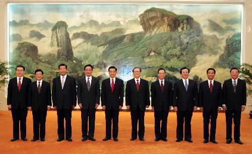 下午五時四十五分,胡錦濤、江澤民、吳邦國、溫家寶、賈慶林、曾慶紅、黃菊、吳官正、李長春、羅干等領導來到參加全會的人員中間,同大家親切見面,并合影留念。