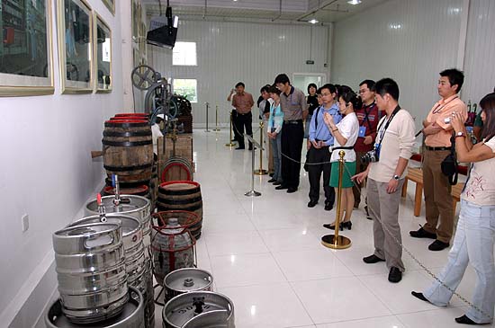 在博物館百年歷史和文化展示區里,順著時空的脈絡,采訪團成員通過詳盡的圖文資料,了解了啤酒的神秘起源、青啤的悠久歷史、青啤數不勝數的榮譽、青島國際啤酒節、國內外重要人物來青啤參觀訪問的情況。