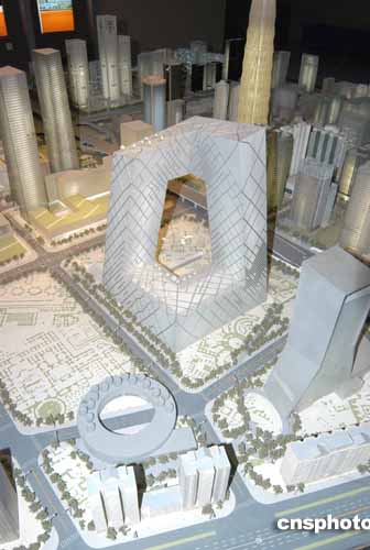 經過多次反復和調整,占地近十九公頃的中央電視臺新大樓于九月二十二日在北京CBD奠基,正式從設計圖紙轉入建設期。新大樓的方案由荷蘭大都會建筑事務所著名設計師庫哈斯設計,“側面S正面O”的特異造型此前引起眾多爭議。建成后每天將有超過一萬名員工在樓內工作,可以容納約二百五十個頻道。圖為央視新樓及周邊地區效果模型。作者:徐曦弋