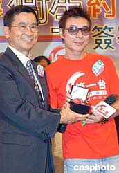 歌星許志安9月23日在香港出席由職業安全健康局、勞工處及香港電臺聯合舉辦「精靈一點---職業衛生約章簽署儀式」記者會,助理廣播處長邵盧善向「職安健大使」許志安頒贈紀記品。作者:鄧慶樂