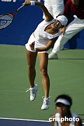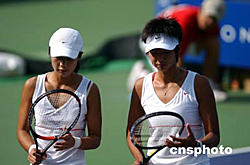 中國選手、雅典奧運會起網球女雙冠軍李婷和孫甜甜(后)不敵俄羅斯選手薩芬娜與瑞士選手加格里亞蒂組合,無緣晉級決賽。中新社記者:盛佳鵬