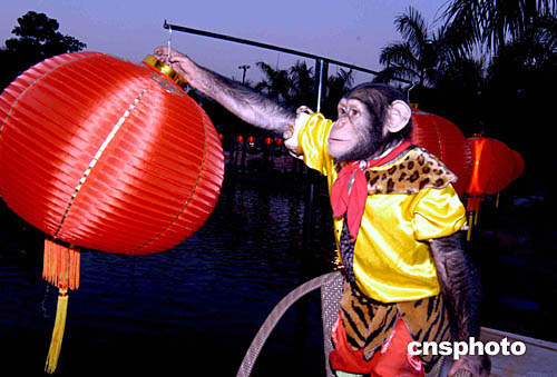兩歲大的猩猩“俊俊”客串“工程師”在湖邊掛上節日的燈籠。